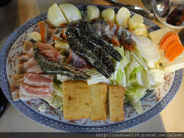 食材有大白菜、洋蔥、豆腐、魚板、鮭魚、蝦子、豬肉片,這些吃不夠都可以再夾,讓你吃到飽~~