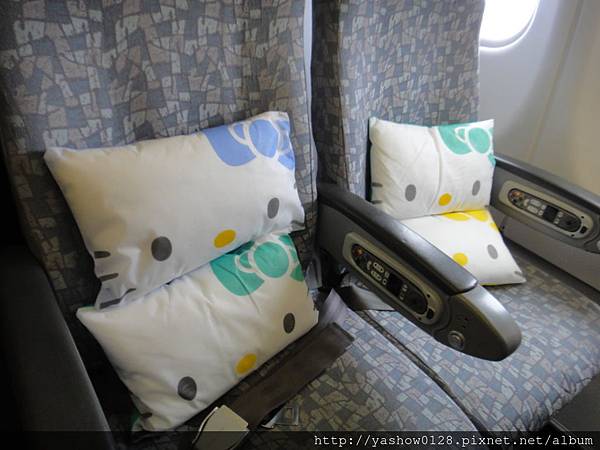 抱枕當然也是Hello kitty的囉,很可愛吧~~而且還有好多種顏色,因為很多座位都是空的,所以我們又多拿一個來墊,一個人墊了兩個抱枕的確有比較舒服喔~~
