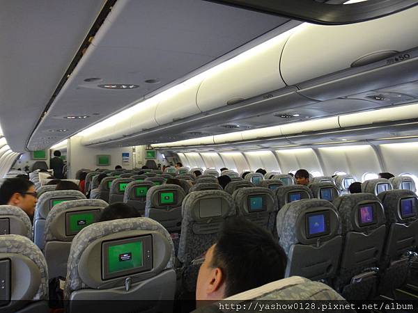 我們這班算是長榮最晚飛回台灣的一班,所以整個後排座位幾乎都沒人了,所以我們自己就自動升等到窗邊的位置囉~~